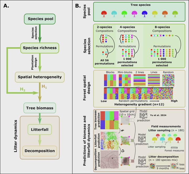 Reforestation and afforestation programs are promoted as strategies to mitigate rising atmospheric CO2 concentrations and enhance ecosystem services. Planting diverse forests is supposed to foster such benefits, but optimal tree planting techniques, especially regarding species spatial arrangement, are underexplored. Here, using field measurements from the subtropical BEF-China experiment, we simulate tree growth, leaf litterfall, and decomposition, as a function of various spatial arrangements of tree species, from clusters of species to random distributions. Our simulations suggest that increasing tree species spatial heterogeneity in forests composed of eight tree species leads to higher biomass production, more evenly distributed litterfall, increased litter decomposition, and associated nitrogen and carbon cycling. These effects on forest nutrient dynamics are amplified with increasing species richness. Our data show that the spatial arrangement of tree species is a critical component determining biodiversity-ecosystem functioning relationships. Therefore, we suggest the explicit consideration of spatial arrangements when planting trees for reforestation and afforestation projects.